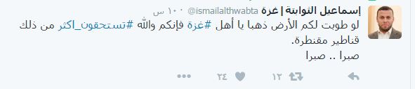 أما مدير شبكة الرأي الإخبارية الصحفي إسماعيل الثوابتة، فكتب يقول "لو طوبت لكم الأرض ذهبا يا أهل #غزة فإنكم والله #تستحقون_اكثر من ذلك قناطير مقنطرة. صبرا .. صبرا".