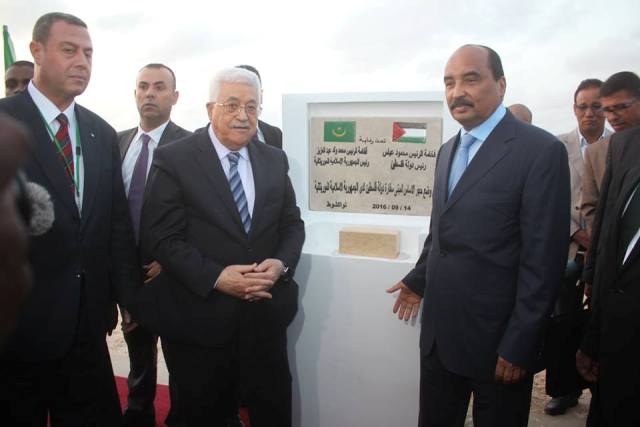 وضع رئيس السلطة الفلسطينية محمود عباس، ورئيس جمهورية موريتانيا محمد ولد عبد العزيز، أمس الأربعاء، حجر الأساس لمقر سفارة دولة فلسطين لدى موريتانيا، في العاصمة نواكشوط.