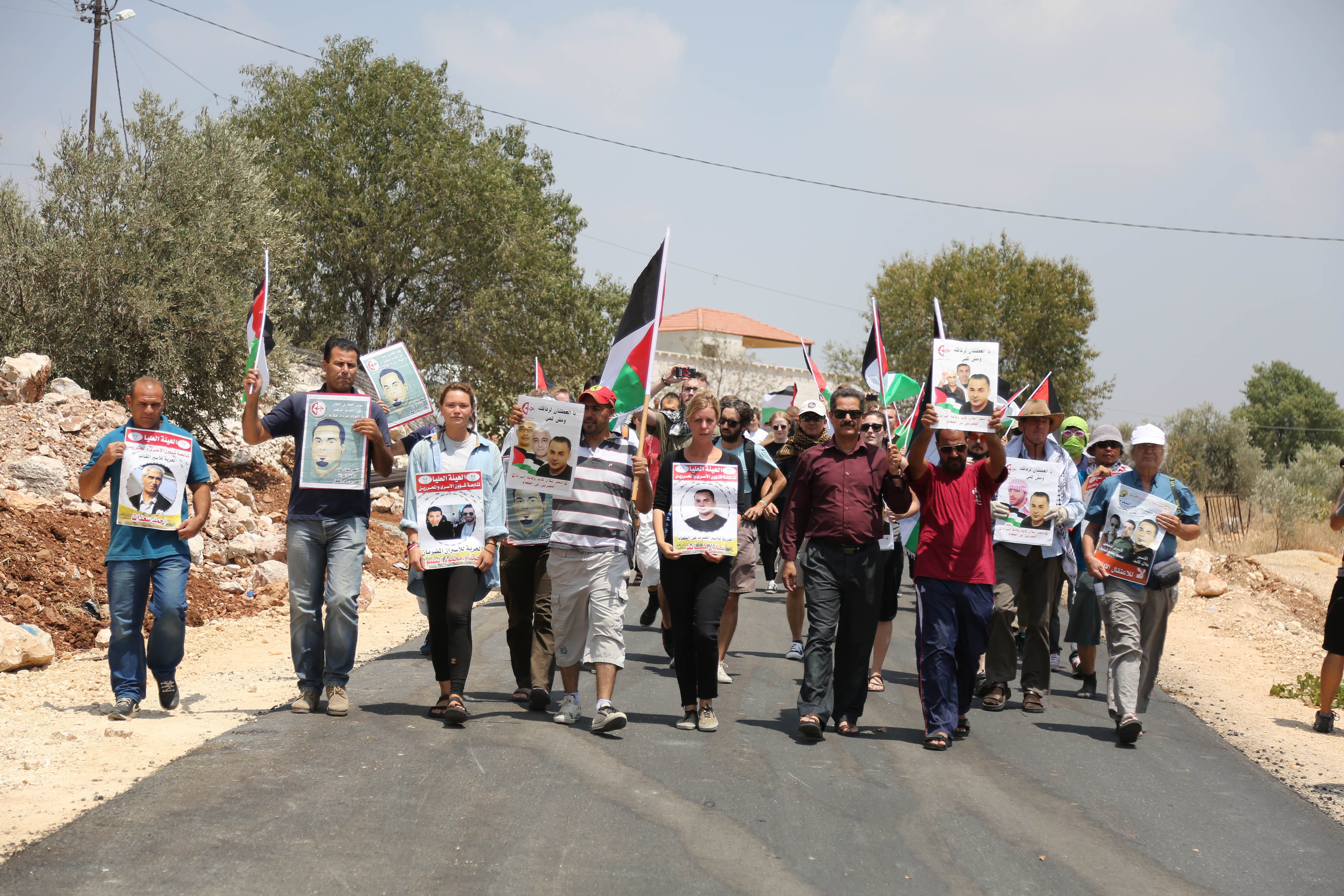 ورفع المشاركون الذين نجحوا في الوصول إلى الجدار الاسمنتي الذي قام الاحتلال ببنائه، العلم الفلسطيني وصور الأسرى محمد ومحمود البلبول والأسير القاضي والهريمي على الجدار.