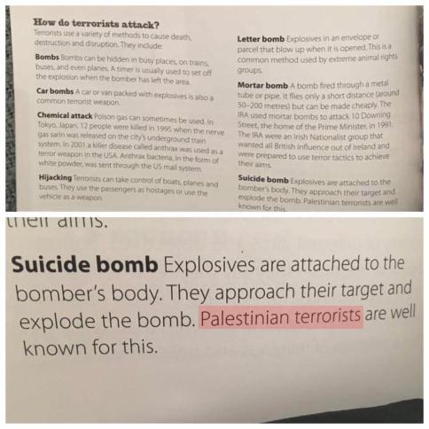 تداول ناشطون أردنيون عبر مواقع التواصل الاجتماعي، أمس، صورة من إحدى صفحات مقرر دراسي "أجنبي" يدرس داخل أحد المدارس الخاصة الأجنبية في الأردن، تعتبر فيه الفلسطينيين "إرهابيين".
