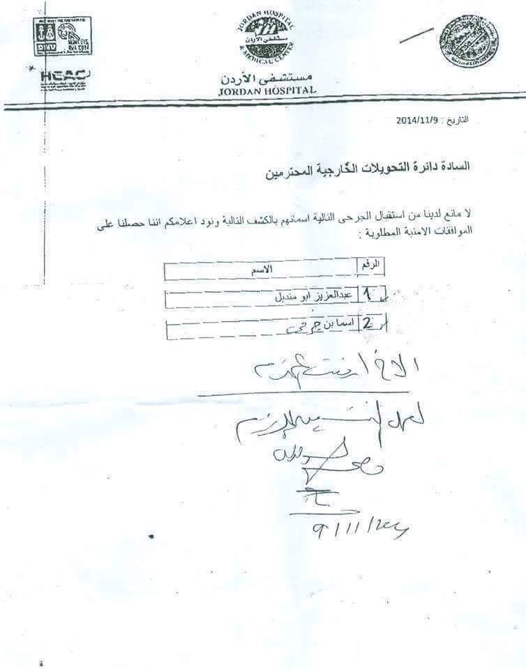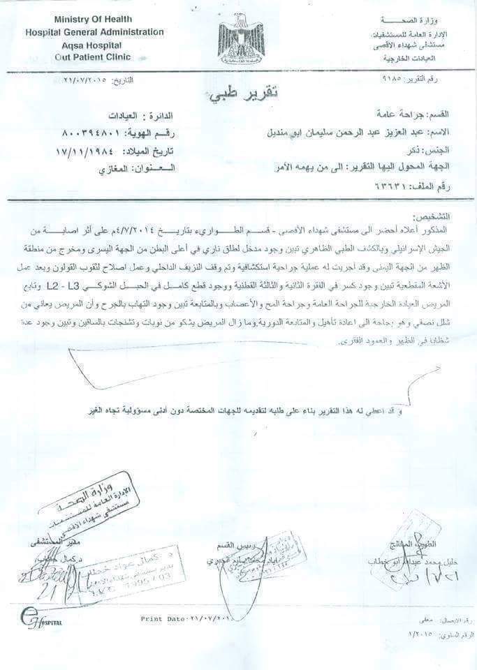 وأوضح أبو منديل :"لغاية اليوم نحاول السفر للعلاج في الخارج لكن الواسطة تلعب دورا كبيرا في هذا الأمر، حاولنا قدر المستطاع، حيث قرر لنا العلاج والسفر إلي الخارج بتاريخ 9/11/2014 إلي دولة الأردن لكن للأسف لم أسافر ولم نعرف السبب، حيث لم يتصلوا بنا ومعي الدليل مرفق بالصور على ذلك".