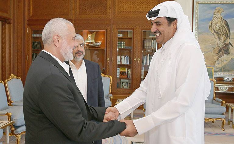 استقبل أمير قطر الشيخ تميم بن حمد آل ثاني في مكتبه بالديوان الأميري، رئيس المكتب السياسي لحركة "حماس" خالد مشعل ونائبه إسماعيل هنية في العاصمة القطرية الدوحة اليوم الاثنين.