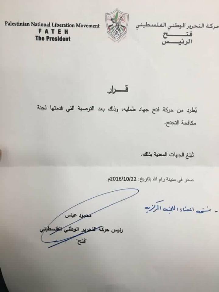 صادق رئيس السلطة الفلسطينية محمود عباس، مساء اليوم السبت، على التوصية التي قدمتها لجنة مكافحة التجنح في حركة فتح بفصل النائب في المجلس التشريعي عن حركة فتح جهاد طمليه من الحركة.