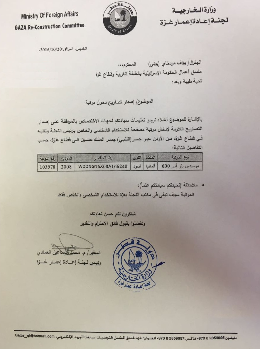 طلب السفير القطري محمد العمادي، رئيس اللجنة القطرية لإعادة إعمار قطاع غزة، من المنسق لحكومة الاحتلال في الضفة المحتلة وقطاع غزة يواف مردخاي تصريح دخول لمركبة مصفحة له ترافقه في قطاع غزة أثناء تواجده.