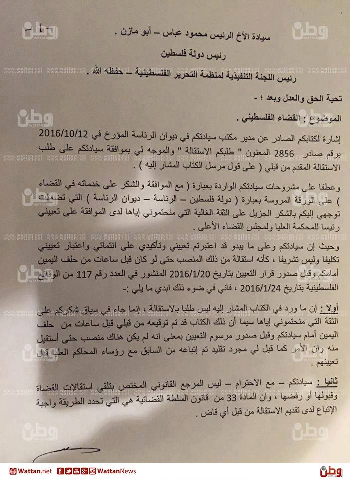 ولاحقا تقدم صرصور بكتاب للرئيس عباس، وأرسل نسخا منه لمؤسسات قانونية يشرح فيها ما حصل معه، ويطلب بإلغاء احالته إلى التقاعد أو قبول استقالته التي يقول إنه لم يقدمها، ويتهم جهات كثيرة بالتأثير في القضاء، وكان قبلها قد اتهم جهات أخرى بمحاولة خطف القضاء.