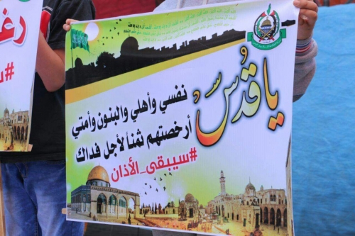 شارك المئات من المواطنين في شمال قطاع غزة بمسيرة غاضبة دعت لها حركة المقاومة الإسلامية حماس في مخيم جباليا بعد صلاة الجمعة من أمام مسجد الخلفاء الراشدين، وذلك تنديداً بمنع رفع الآذان بالقدس المحتلة ومساجد الداخل.