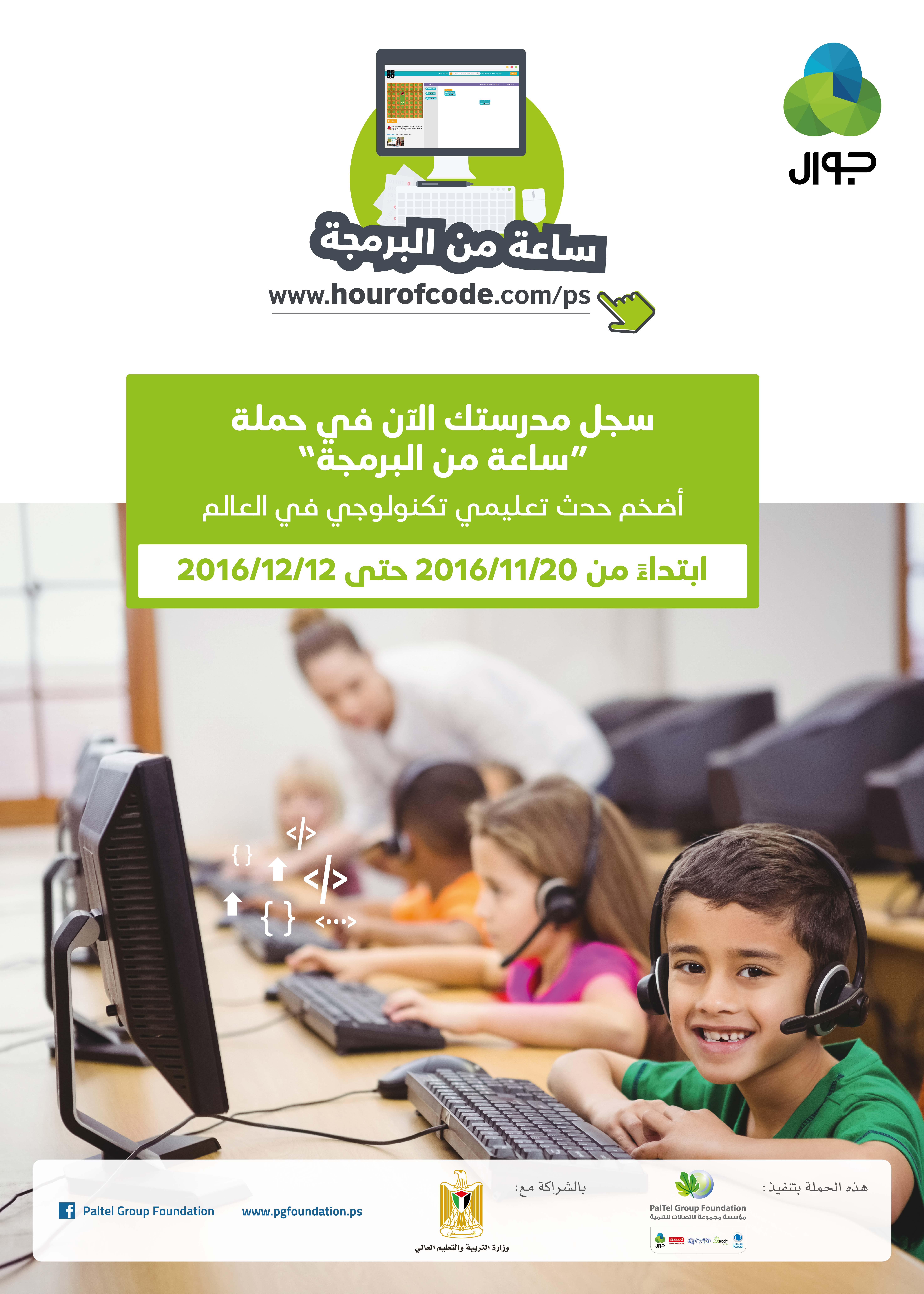 أطلقت شركة جوال وللسنة الثالثة على التوالي الحملة العالمية "ساعة من البرمجة" بمشاركة أكثر من 180دولة حول العالم، و التي تنفذها مؤسسة مجموعة الاتصالات للتنمية، الذراع التنموي لمجموعة الاتصالات الفلسطينية بشركاتها (جوال ، شركة الاتصالات، حضارة، ريتش ، بالميديا)، وستستمر الفعالية لمدة ثلاث أسابيع ابتداءاً من 20/11/2016 وحتى 12/12/2016، وتهدف الحملة الى تحفيز الطلبة والمهتمين من مختلف الاعمار والفئات على مستوى العالم، على التعلم اساسيات ولغات البرمجة بطريقة سهلة وممتعة.