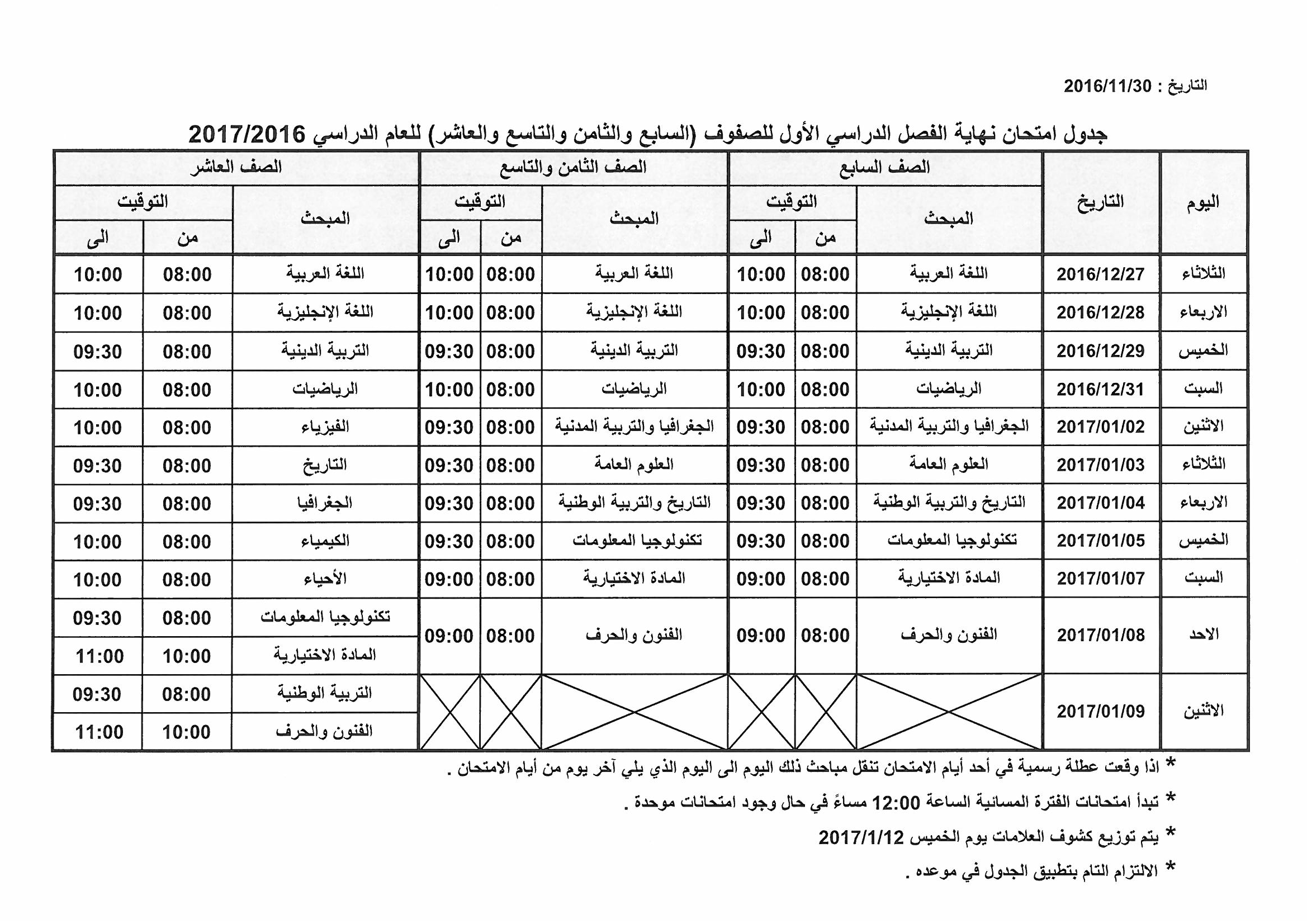 أعلنت وزارة التربية والتعليم العالي بغزة مواعيد امتحانات نهاية الفصل الدراسي الأول للعام الدراسي 2016/2017 من الصف الرابع الأساسي وحتى الأول الثانوي بفروعه.