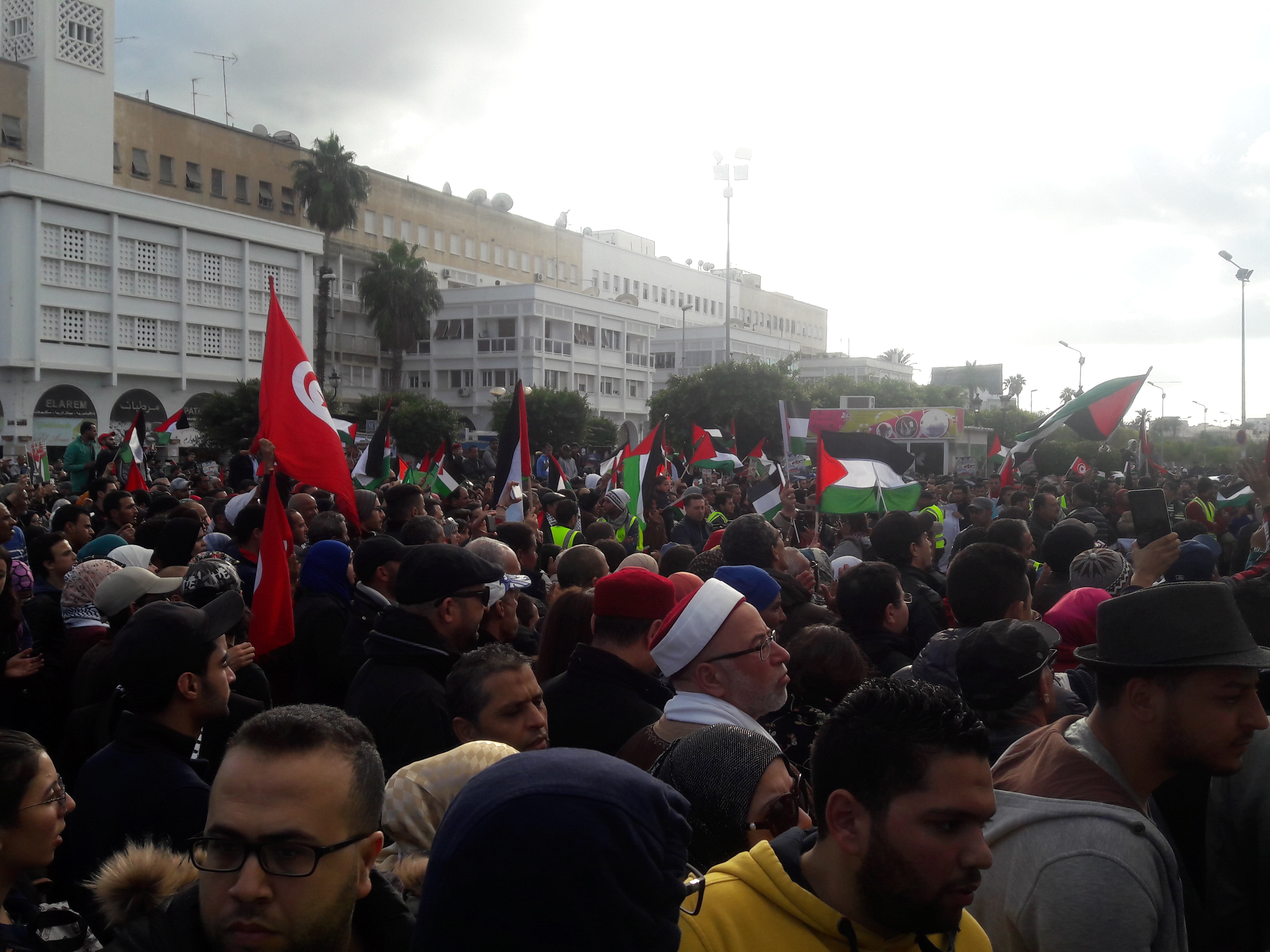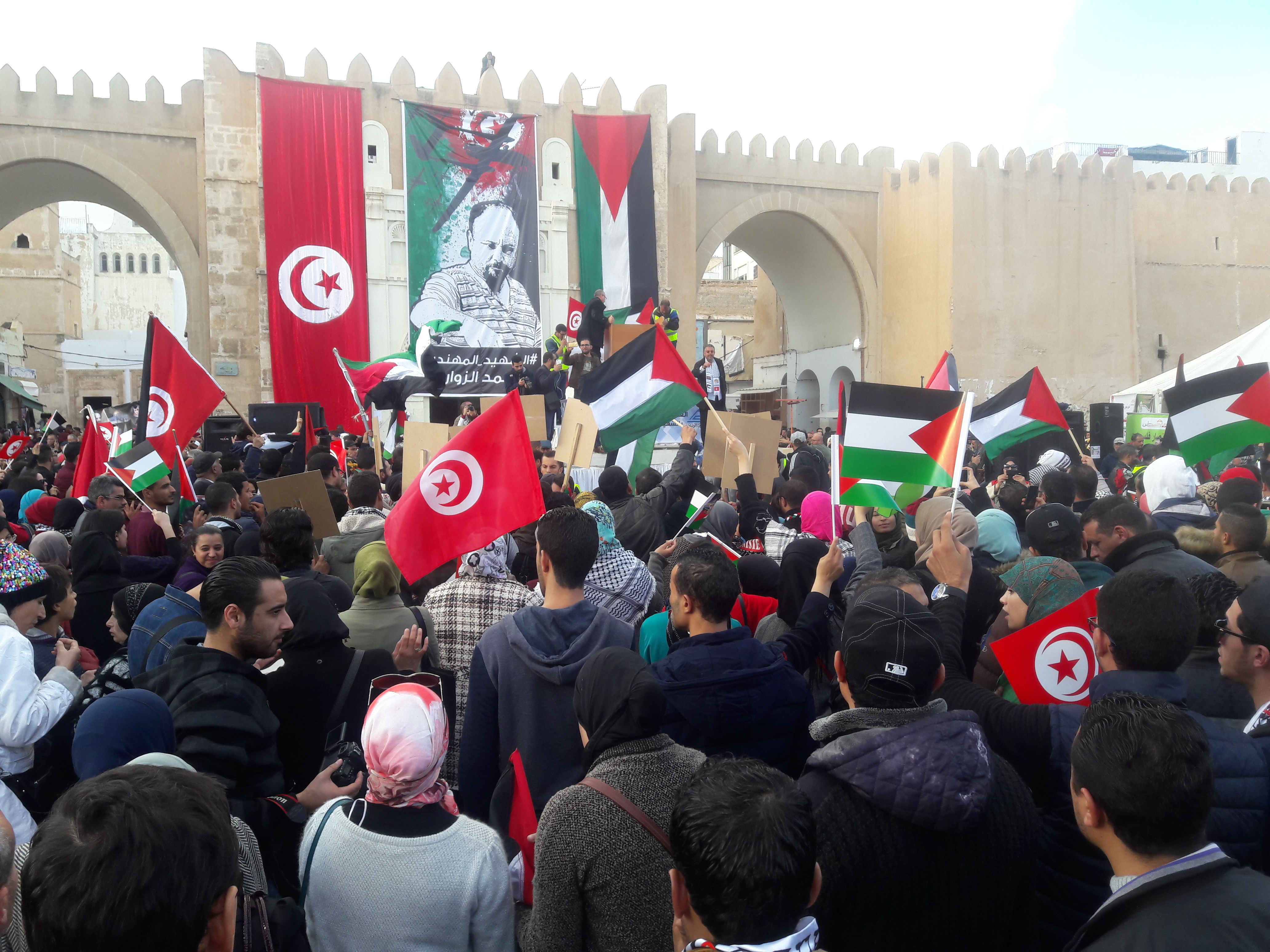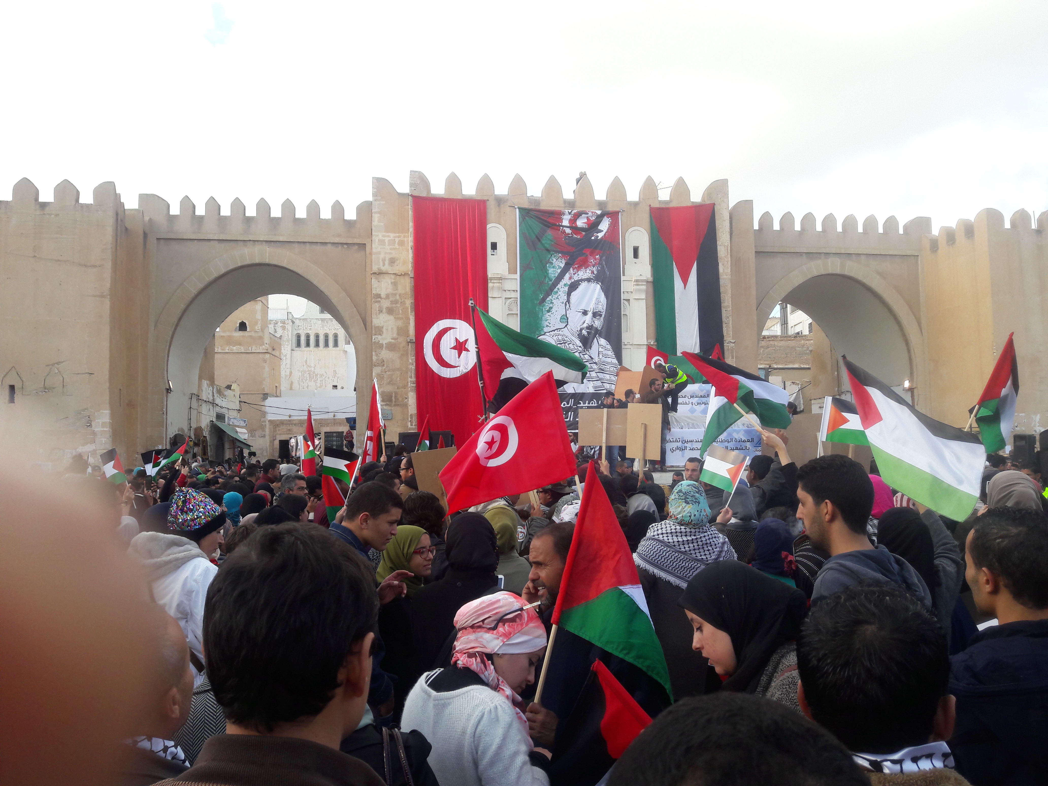 وردد المتظاهرون شعارات من قبيل "مقاومة مقاومة، لا صلح ولا مساومة. فلسطين مش للبيع وينيو تجريم التطبيع..."، كما رفعوا الأعلام الفلسطينية والتونسية وصور محمد الزواري.
