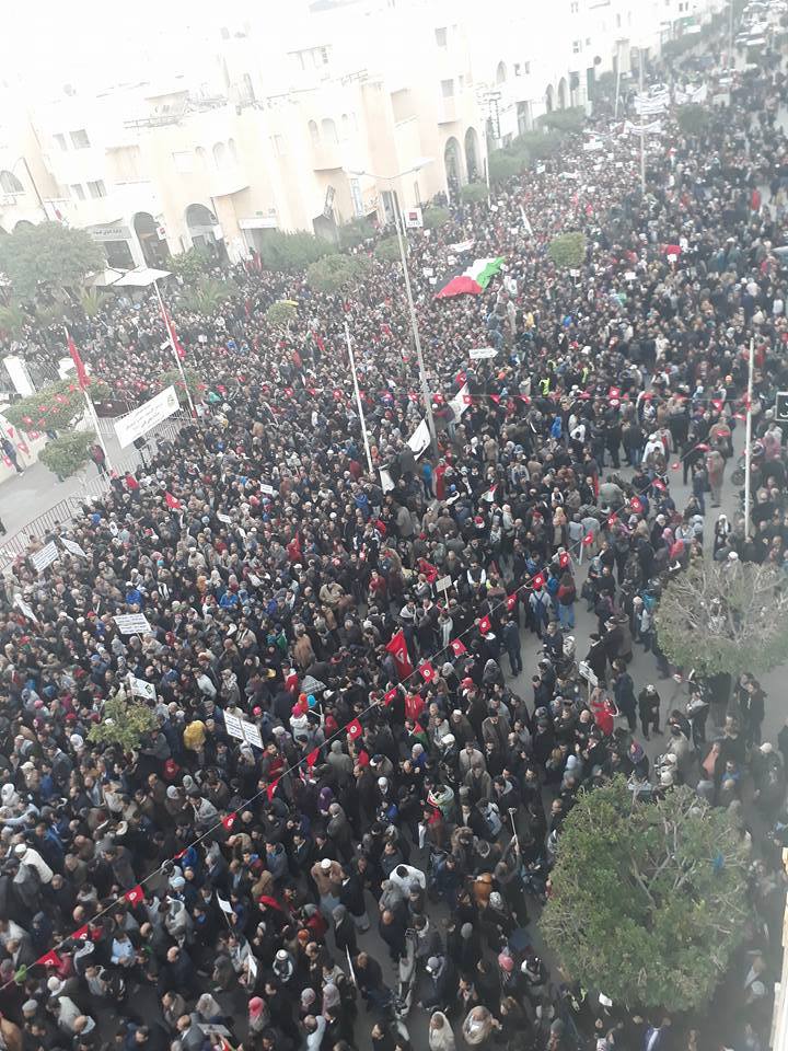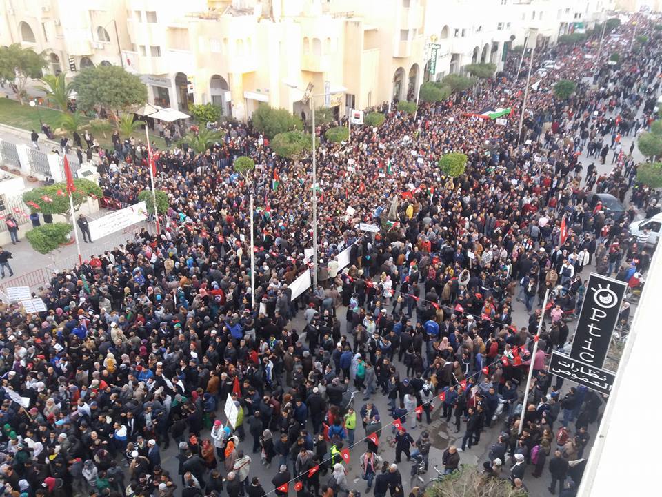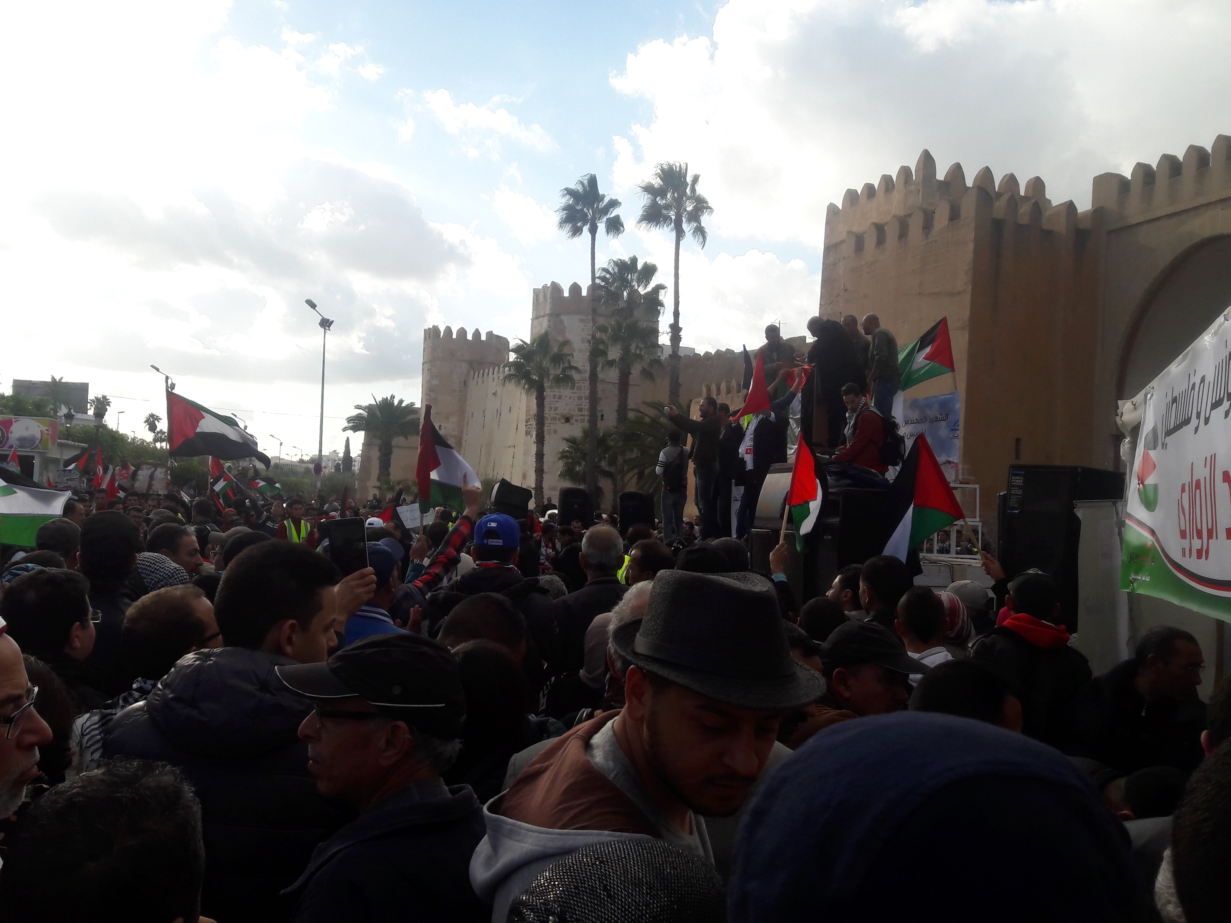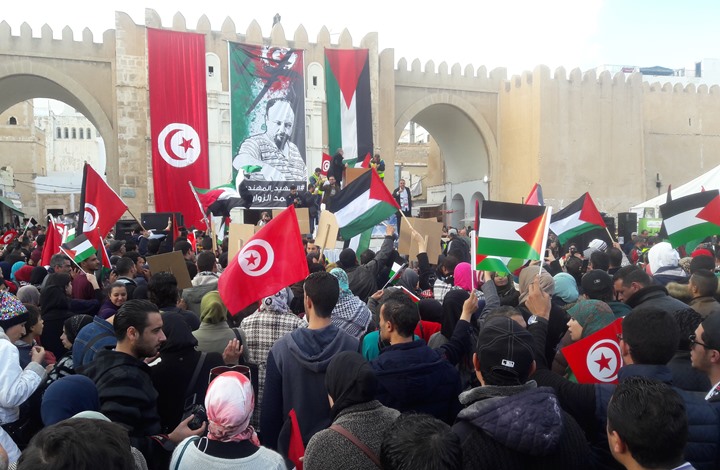 وردد المتظاهرون شعارات من قبيل "مقاومة مقاومة، لا صلح ولا مساومة. فلسطين مش للبيع وينيو تجريم التطبيع..."، كما رفعوا الأعلام الفلسطينية والتونسية وصور محمد الزواري.