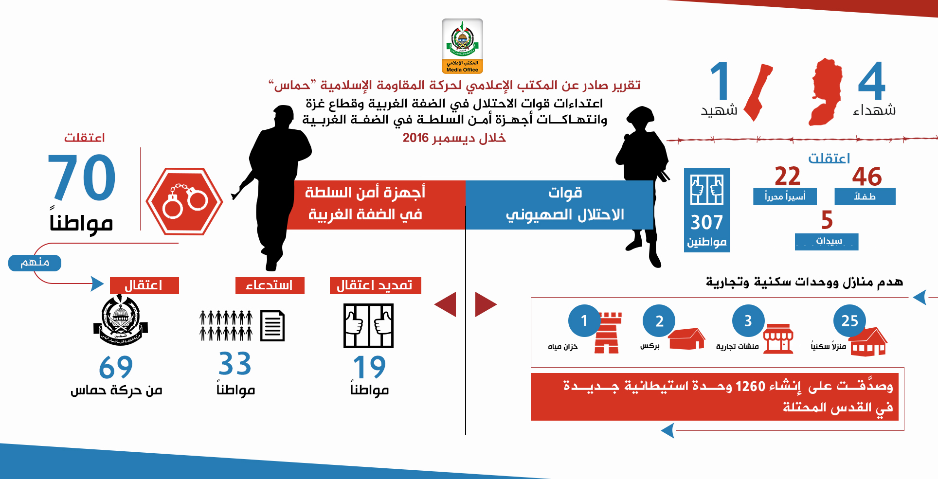 أصدر المكتب الإعلامي لحركة المقاومة الإسلامية "حماس" تقريره الشهري لرصد اعتداءات أجهزة أمن السلطة في الضفة الغربية واعتداءات قوات الاحتلال في الضفة الغربية وقطاع غزة خلال كانون الأول (ديسمبر) 2016م.