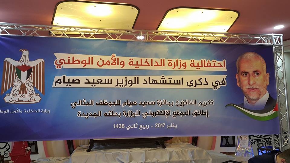 كرمت وزارة الداخلية والأمن الوطني، صباح الأحد، بمسابقة الشهيد الوزير سعيد صيام، للموظف المثالي لعام 2016م، وكما أطلقت الحلة الجديدة لموقعها الالكتروني على الشبكة العنكبوتية تزامناً مع الذكرى السنوية الثامنة لاستشهاد وزيرها السابق النائب صيام خلال حرب الفرقان عام 2009 م.
