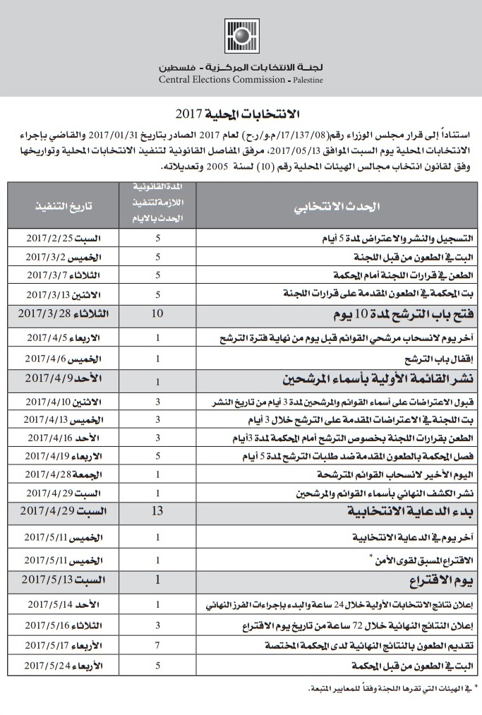 ويتضمن الجدول الزمني المدد القانونية للمراحل الانتخابية المختلفة ابتداءً من عملية تسجيل الناخبين ونشر سجل الناخبين للاعتراض والذي يستمر خمسة أيام اعتبارا من صباح يوم السبت 25 شباط 2017، مروراً بفتح باب الترشح لعشرة أيام خلال الفترة من صباح يوم الثلاثاء 28 آذار ولغاية مساء يوم الخميس 6 نيسان 2017، على أن تنشر القائمة الأولية بأسماء المرشحين يوم 9 نيسان.