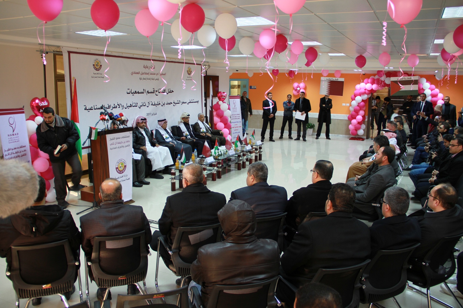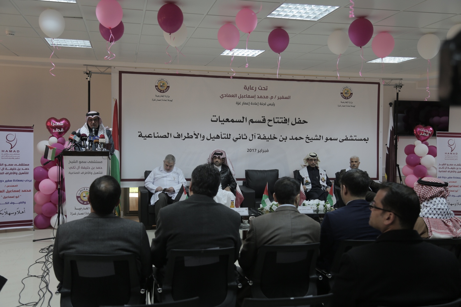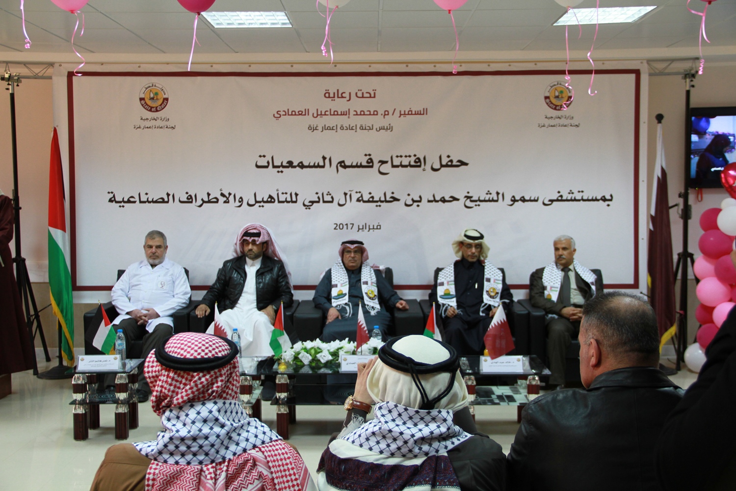 افتتح رئيس اللجنة القطرية لإعادة إعمار غزة السفير محمد العمادي، قسم السمعيات في مستشفى سمو الشيخ حمد بن خليفة آل ثاني للتأهيل والأطراف الصناعية، في حفلٍ نٌظّم في الطابق الرابع من المستشفى.
