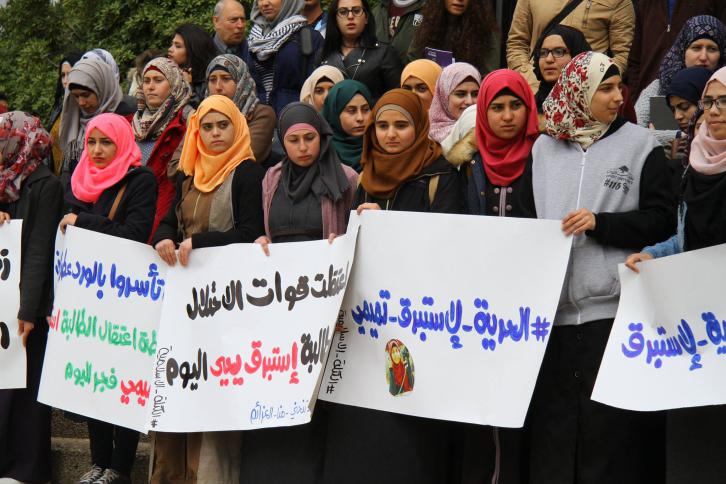 نظم عدد من طلبة جامعة بير زيت، اليوم الاثنين وقفة تضامنية في ساحة الجامعة احتجاجا على اعتقال طالبة الإعلام استبرق التميمي.