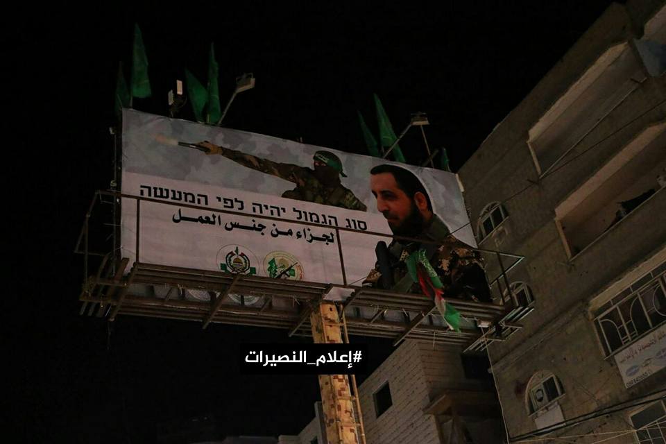 وحملت اللافتة، صورة لمقاوم من القسام يحمل مسدسا ويصوبه للأمام فيما كتب بجانبها "الجزاء من جنس العمل".