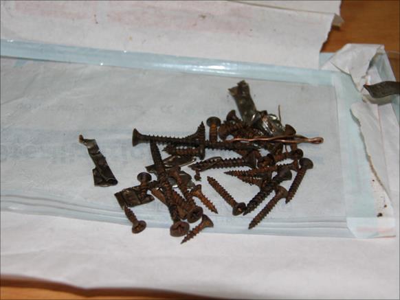 ويضيف أنه كان المتوقع أن نستخرج عشر قطع، لكن كمية الأجسام المعدنية المستخرجة كانت مفزعة وغريبة للطاقم المعالج الذي تفاجأ بهذه الكمية الكبيرة من أيدي الملاعق والبراغي.