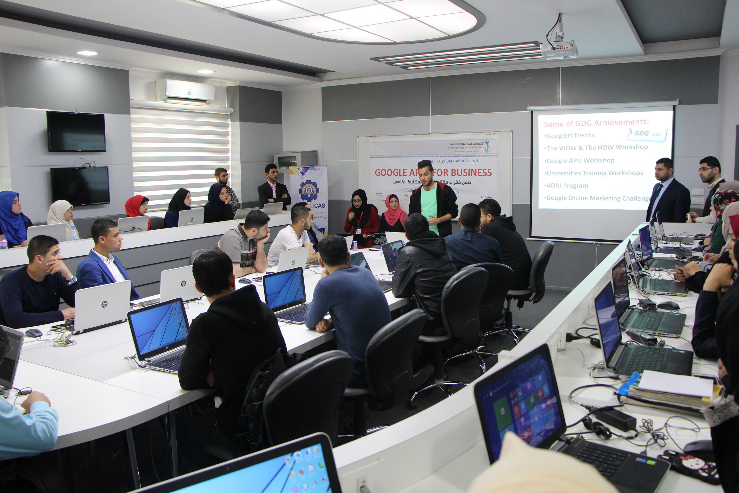 نظم قسم العلوم الإدارية والمالية في الكلية الجامعية للعلوم التطبيقية وبالتعاون فريق مطوري Google غزة لقاء تدريبيا بعنوان Google Apps for Business، وذلك بحضور ومشاركة كل من السيد المعتصم بالله الحلبي نائب رئيس القسم ولفيف من مدرسي القسم، والمهندس عمر بدوي رئيس فريق المطورين وعدد من أعضاء الفريق والعشرات من طلبة اختصاص السكرتارية وأتمته مكاتب.