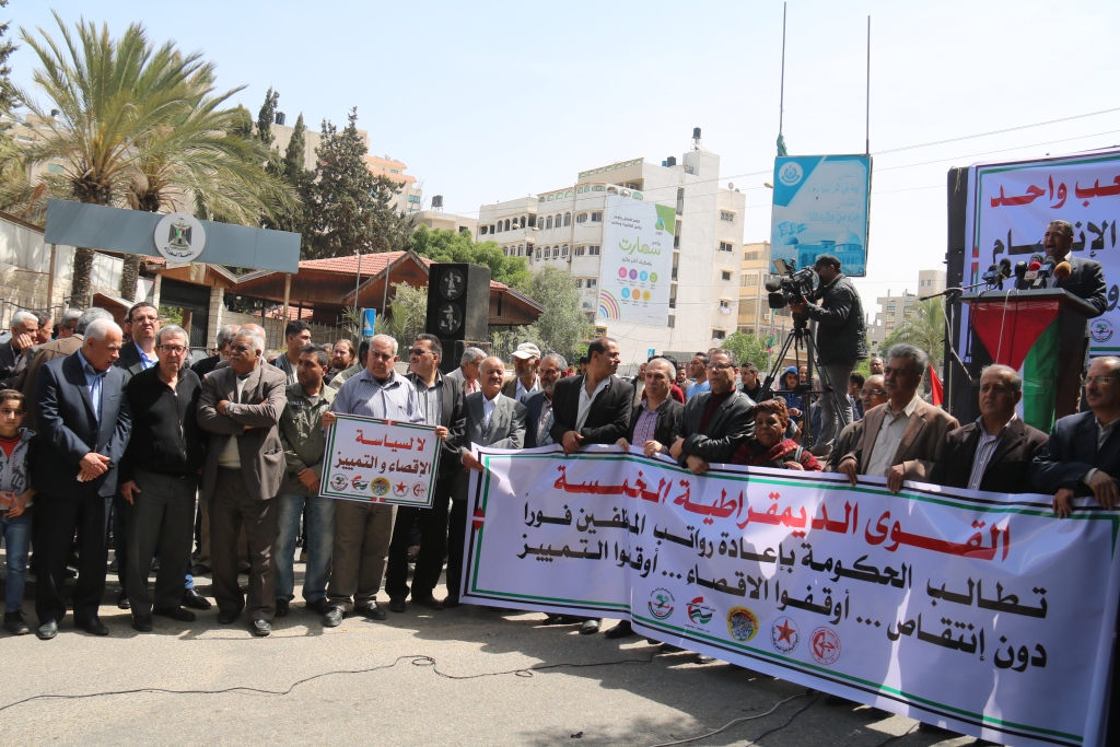 اعتصمت القوى الديمقراطية الخمسة بغزة، أمام مقر مجلس الوزراء، تنديدًا بقرار الخصومات، والذي أقرته حكومة رامي الحمد الله بموافقة الرئيس محمود عباس قبل أيام.