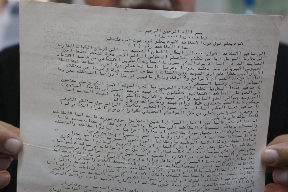 يستعيد أبو دوّاس: كان الناس يتسابقون للحصول على نداءات الانتفاضة، التي توزع في جوف الليل، وكانت مجهولة المصدر وطريقة النقل، وأذكر أن شوارع طوباس كانت تخلو من البيانات مع أول بزوغ للفجر، وكانت الفصائل الوطنية كلها تساهم في توزيعها، ويُعاد إلقاء أبرز الفعاليات، وبخاصة الدعوة إلى الإضراب التجاري في مكبرات الصوت والمساجد، إضافة إلى الحرص على رقم البيان.