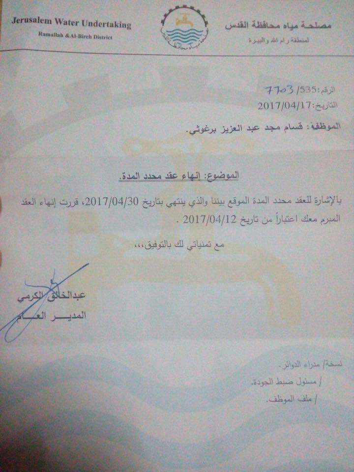 فصلت مصلحة مياه محافظة القدس/ رام الله نجل الشهيد مجد البرغوثي الأسير قسام البرغوثي "24عاما" من عمله وذلك بعد أسبوع من اعتقاله من قبل قوات الاحتلال وتزامنًا مع ذكرى يوم الأسير الفلسطيني.