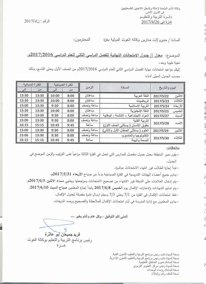 أعلنت وكالة غوث وتشغيل اللاجئين الفلسطينيين – الأونروا- عن تقديم موعد امتحانات الطلبة للعام 2016-2017 يوماً واحداً فقط.