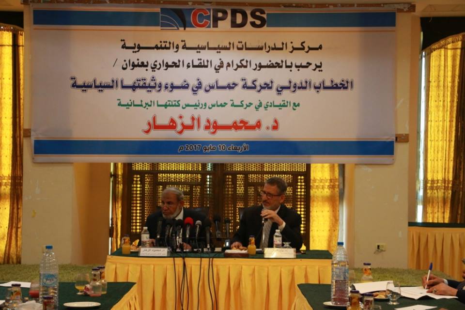 حديث الزهار جاء خلال لقاء حواري، عقده مركز الدراسات السياسية والتنموية، بعنوان: " الخطاب الدولي لحركة حماس في ضوء وثيقتها السياسية", مشيرًا إلى أن ما ورد في الوثيقة حول القبول بدولة فلسطينية في حدود 1967 لا يعني الاعتراف بإسرائيل أو التخلي عن حدود الـ 48.