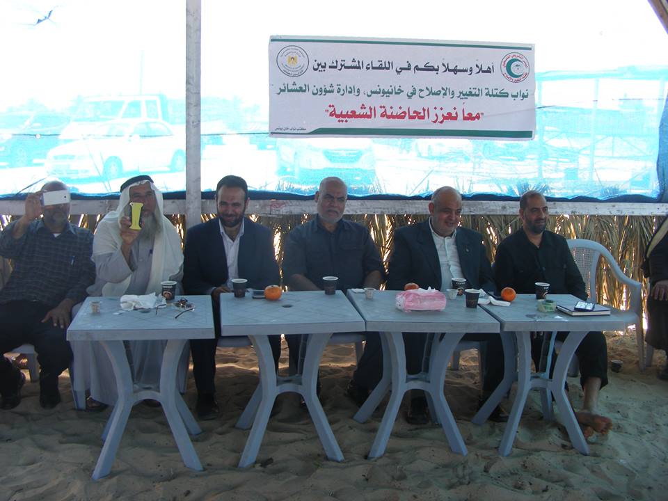 شاركت كتلة التغيير والإصلاح في محافظة خان يونس بالتعاون دائرة شؤون العشائر في لقاء بعنوان "معاً نعزز الحاضنة الشعبية"، حضر اللقاء النائبان د. خميس النجار و أ. يحيى العبادسة، والشيخ محمد أبو دقة أبو سليمان رئيس دائرة شؤون العشائر، والقيادي في حركة حماس حماد الرقب بالإضافة لمدير داخلية محافظة خان يونس الأستاذ محمود سالم.