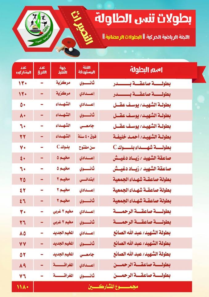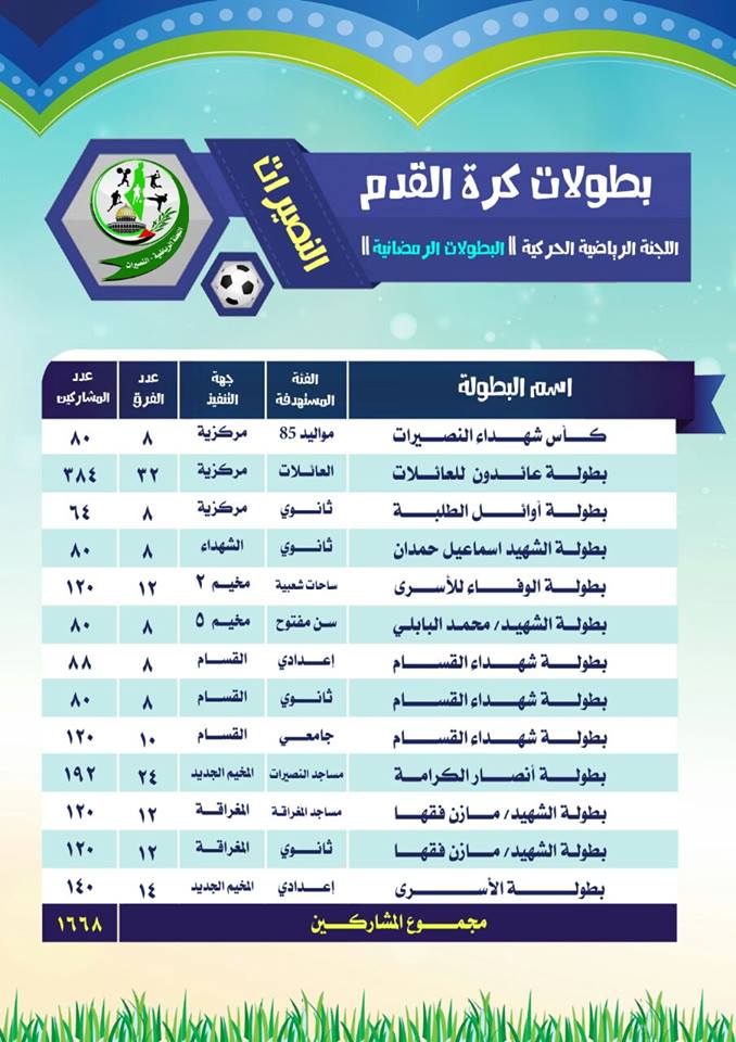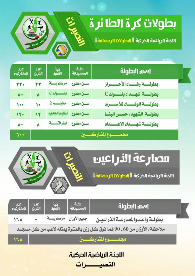 مع حلول شهر رمضان وضمن خطتها السنوية أطلقت اللجنة الحركية الرياضية بالنصيرات عشرات البطولات في مختلف الرياضات.