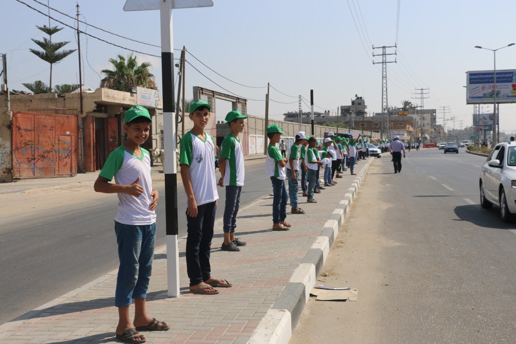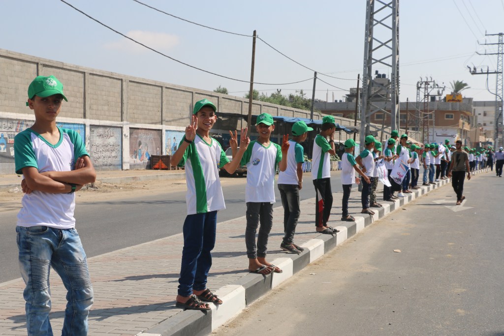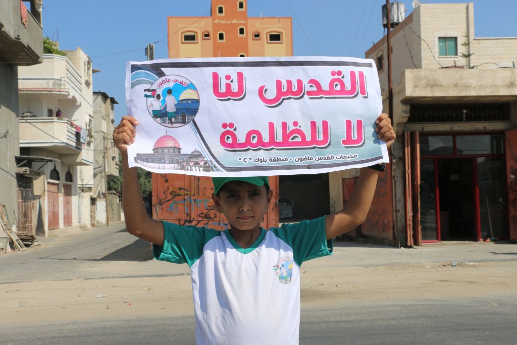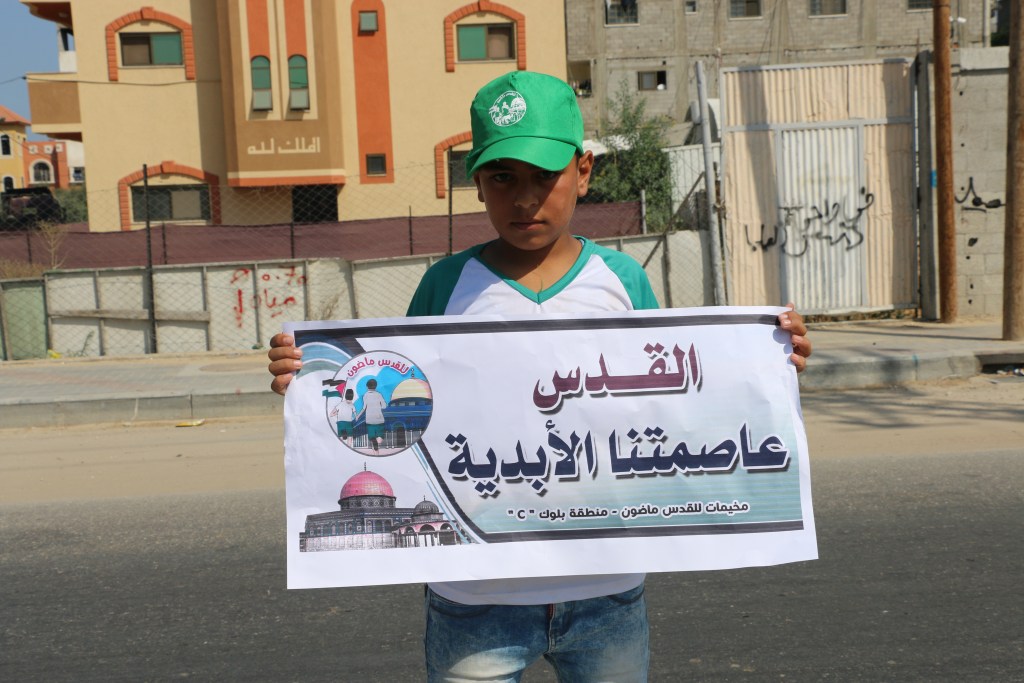 نظمت لجنة المخيمات الصيفية للقدس ماضون في النصيرات، سلسلة بشرية نصرة للقدس والمسجد الأقصى على شارع صلاح الدين، بمشاركة عشرات الطلبة المشاركين في المخيمات تخللها رفع اللافتات المناصرة للقدس.
