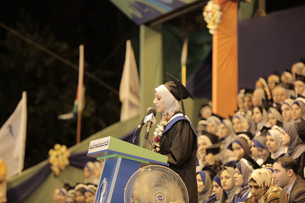 وفي كلمتها ممثلة عن الخريجين قالت الخريجة المتفوقة ولاء الترك: " من الكلية الجامعية للعلوم التطبيقية كانت البداية، ومن مرافقها ومختبراتها وقاعاتها الدراسية كانت الانطلاقة، منها نهلنا العلم والمعرفة على يدي نخبة من المدرسين ذوي الكفاءة العالية ومن أصحاب الخبرة الطويلة، فكان الغراس الطيب يرتوي أدبا وثقافة وعلما وخلقا، والثمرة تنمو وتكبر يوما بعد يوم حتى وصلنا إلى هذه اللحظة العظيمة، لحظة القطاف، فالحمد لله الذي وفقنا أن ندرك هذه اللحظة الجميلة بحضور أهلنا وذوينا وأحبتنا الذي ساندونا ويساندونا على الدوام دون كلل أو ملل".