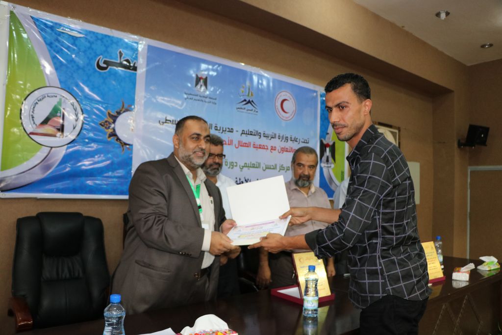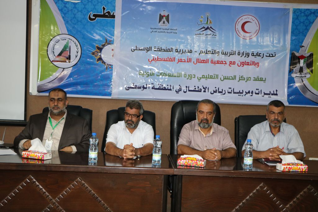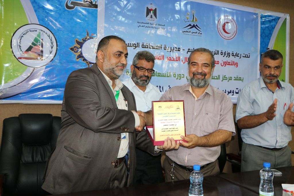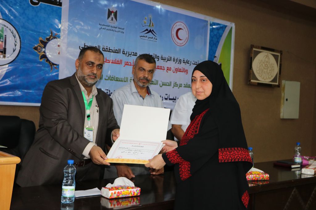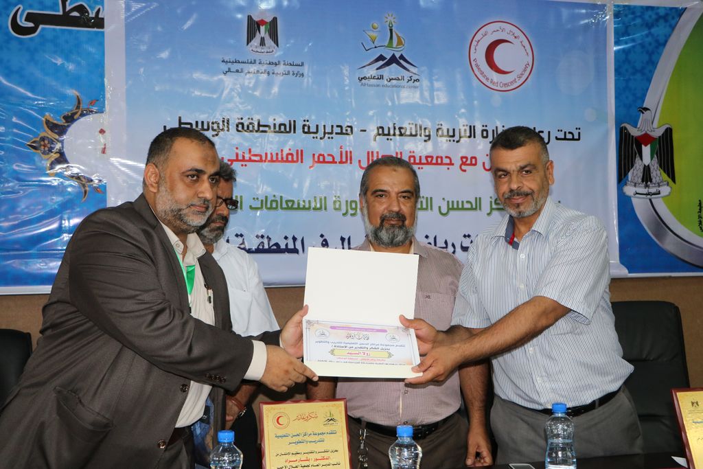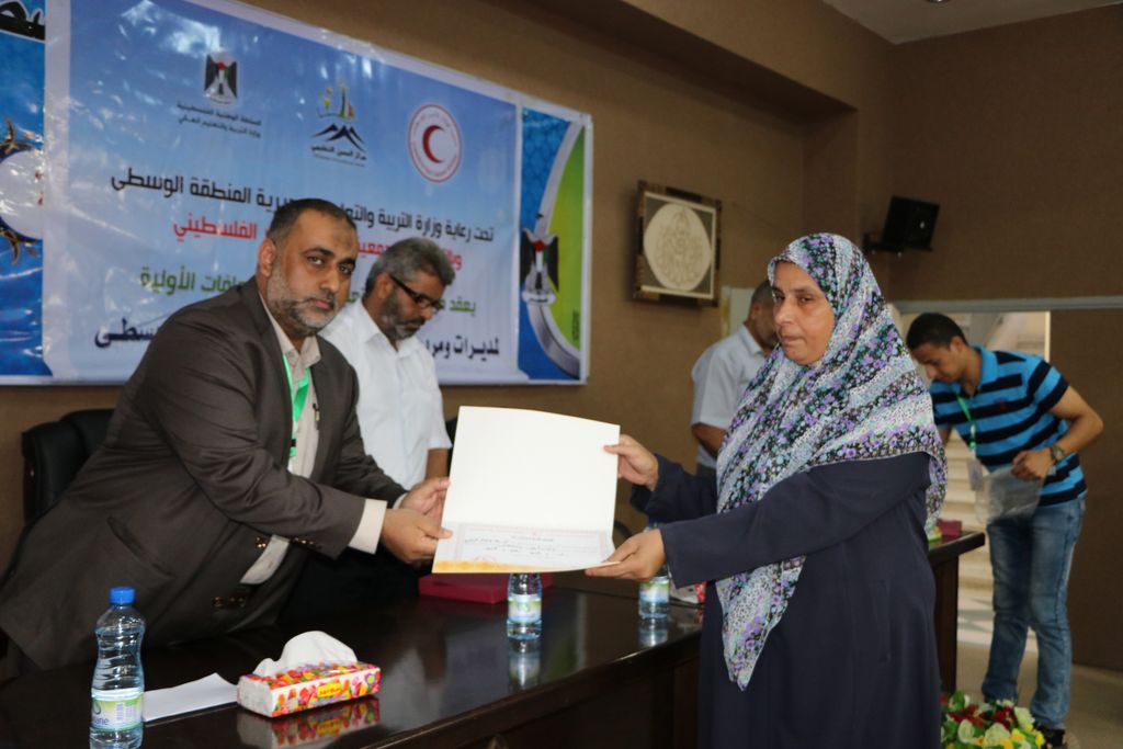 نظمت مديرية التربية والتعليم بالوسطى احتفالاً لتكريم مديرات ومربيات رياض الأطفال المشاركات في دورة الإسعافات الأولية بحضور مدير الدائرة الإدارية ماهر أبو زر ورئيس قسم التعليم العام محمود بخيت ورئيس قسم العلاقات العامة أحمد دلول، ود. بشار مراد من جمعية الهلال الأحمر الفلسطيني، ومدير مركز الحسن التعليمي عبد الوهاب أبو العطا، وذلك بقاعة الاجتماعات بمركز التدريب التربوي بالوسطى.