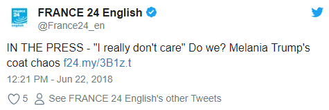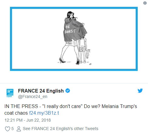وتداولت وسائل الإعلام الأمريكية صوراً للسيدة الأولى وهي ترتدي معطفاً كتب عليه عبارة: "أنا حقا لا أبالي فهل تبالي أنت؟"، وذلك في أثناء توجهها لزيارة مركز احتجاز الأطفال المهاجرين في ولاية تكساس جنوبي الولايات المتحدة الأمريكية.