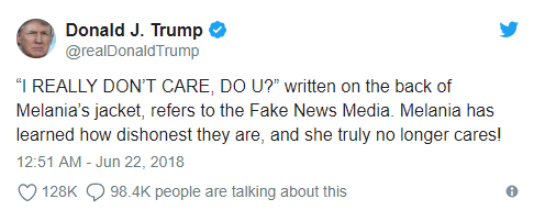 وبينما دافع الرئيس ترامب عن زوجته عبر تويتر، بالقول إن العبارة على المعطف "تشير إلى الأخبار الكاذبة التي ينشرها الإعلام"، ردت المتحدثة باسمها بالقول، إنه "مجرد معطف ولم يكن هناك أية رسالة مخفية من خلال اختياره".