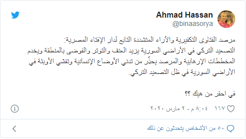 ووجهت دائرة الإفتاء المصرية طلبا إلى المجتمع الدولي، من أجل الضغط على تركيا، لإيقاف عمليتها التي تستهدف النظام السوري.