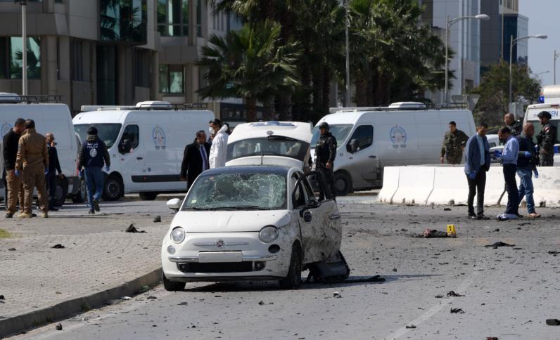 قال التلفزيون الرسمي التونسي إن عنصرين ارهابيين قتلا في تفجير انتحاري قرب مقر السفارة الأمريكية.