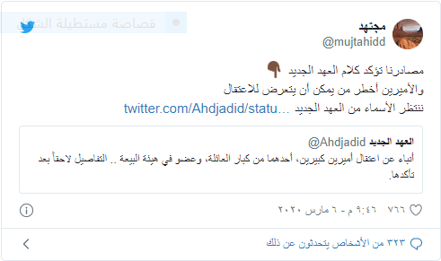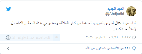 وأورد “العهد الجديد” في تغريدةٍ مقتضبة رصدتها “وطن” أن أحد الأميرين المُعتقلين من كبار العائلة، وعضو في هيئة البيعة.