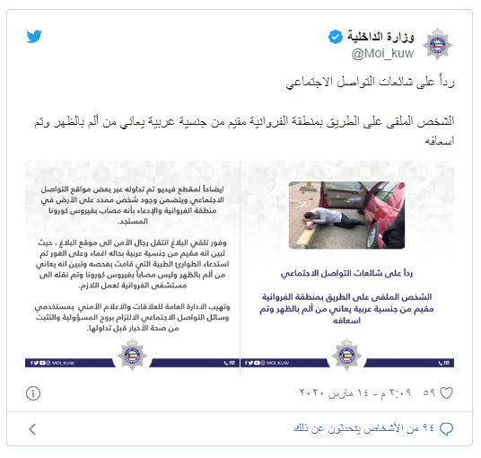 نفت وزارة الداخلية الكويتية، اليوم السبت، أن يكون شخص ظهر في مقطع فيديو وهو ملقى على الطريق بمنطقة الفروانية مصابا بالوباء العالمي كورونا.
