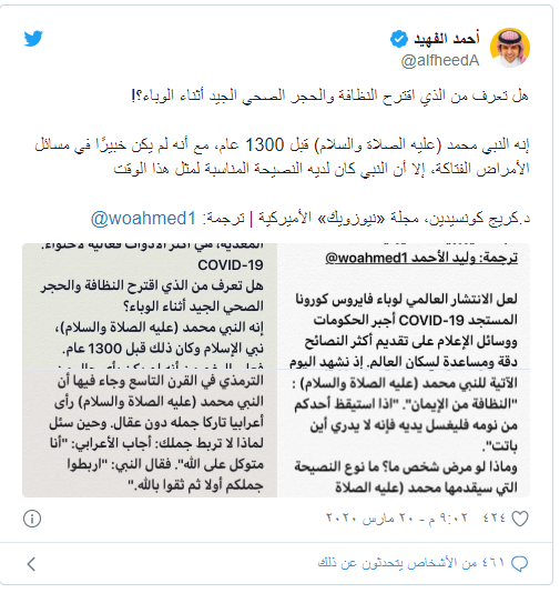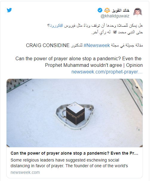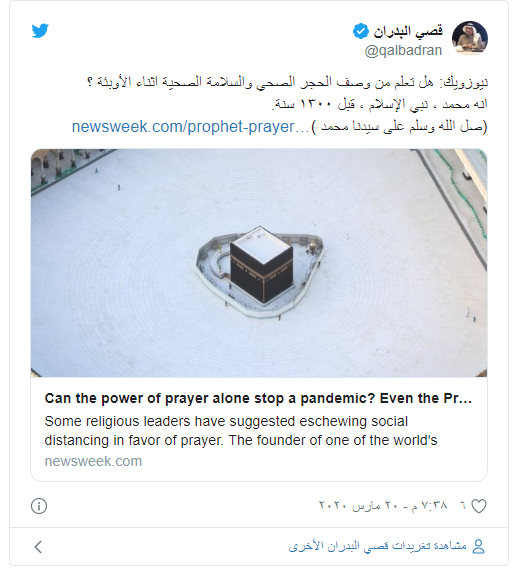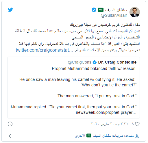 كما لفت إلى أن النبي محمد صلى الله عليه وسلم كان يعرف متى يوازن بين الإيمان والعقل (الأخذ بالأسباب)، مناقشا ما طرحه البعض بأن الصلاة ستكون أفضل لإبقائك آمنا من فيروس كورونا، بدلا من الالتزام بتعليمات الحجر الصحي".