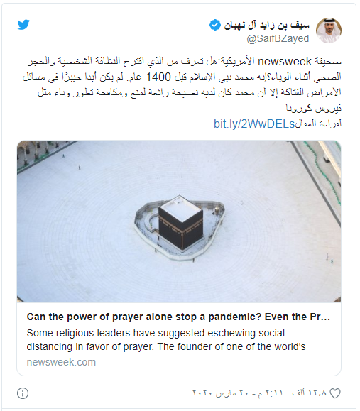 تفاعل نشطاء على مواقع التواصل الاجتماعي مع تقرير نشرته صحيفة "نيوزويك" الأمريكية حول تعاليم جاء بها النبي محمد (صلى الله عليه وسلم)، لمكافحة الأوبئة.