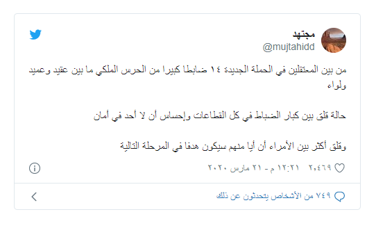 وذكر الحساب في تغريدته أنه "من بين المعتقلين في الحملة الجديدة 14 ضابطا كبيرا من الحرس الملكي، ما بين عقيد وعميد ولواء"، مؤكدا أن "هناك حالة قلق بين كبار الضباط في كل القطاعات، وإحساس أن لا أحد في أمان".