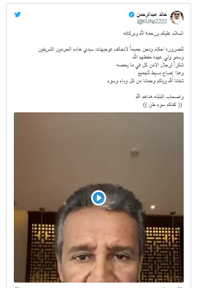 وتابع قائلا: "صليت وبعدها واجهت نقطة تفتيش تبع الحرس الوطني وطلبوا مني إيضاح عدم الالتزام بالحظر وشرحت لهم من وين جاي ولأي سبب وتجاوبوا معي مشكورين، الله يجزاهم خير، الحقيقة أنهم رجال أوفياء أمناء في خدمة مليكهم ووطنهم ودينهم، من ناحية التصوير الظاهر أنه شيء طبيعي، فأنا أقول لأصحاب البلبلة، كفاكم بلبلة هذول رجال أمن في أداء الواجب وهم لا كبير ولا صغير".