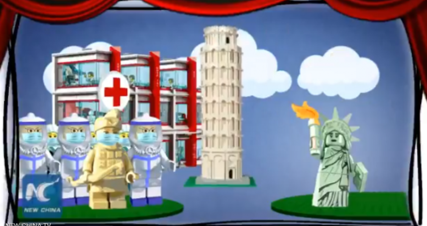 طرحت الصين فيلم رسوم متحركة قصيرا، يحمل عنوان "ونس أبون ايه فيرس"، تسخر من خلاله من تعامل الولايات المتحدة مع أزمة فيروس كورونا، واستخدمت به رموزا شبيهة بالمكعبات البلاستيكية لتجسيد البلدين.