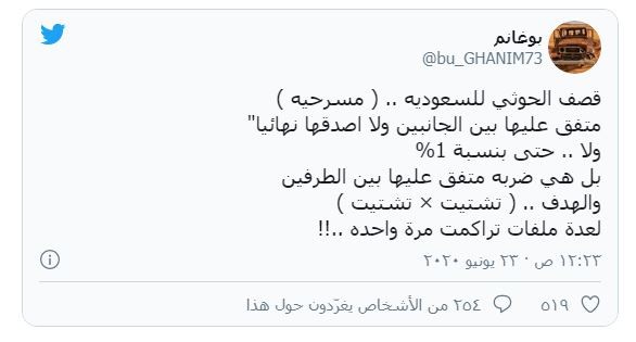شكك حساب شهير، بالرواية السعودية حول قصف الحوثي للرياض، مشيراً إلى أن قيام الحوثي بعملية القصف كان عبارة عن “مسرحية” متفق عليها من الجانبين. حسب قوله.