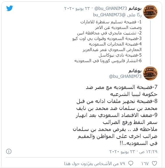 وزاد: “7- فضيحة السعودية مع مصر ضد حكومة ليبيا الشرعية، 8- فضيحة تجهيز ملفات إدانة من قبل محمد بن سلمان ضد محمد بن نايف”.