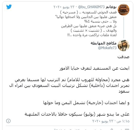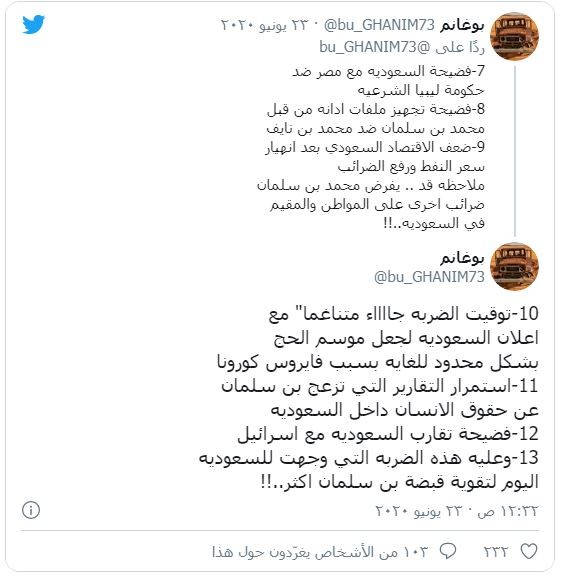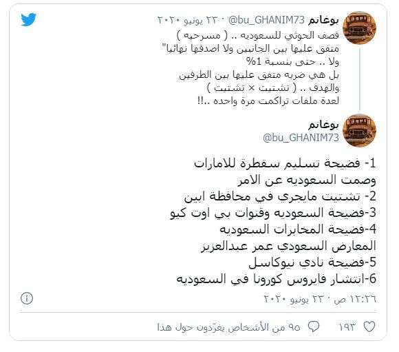 وأضاف: “10- توقيت الضربة جاء متناغماً مع إعلان السعودية لجعل موسم الحج بشكل محدود للغاية بسبب كورونا، 11- استمرار التقارير التي تزعج بن سلمان عن حقوق الإنسان داخل المملكة، 12- فضيحة تقارب السعودية مع إسرائيل، 13- وعليه هذه الضربة التي وجهت للسعودية اليوم لتقوية قبضة بن سلمان أكثر”.
