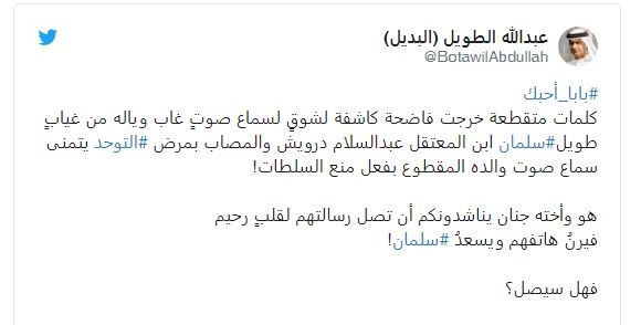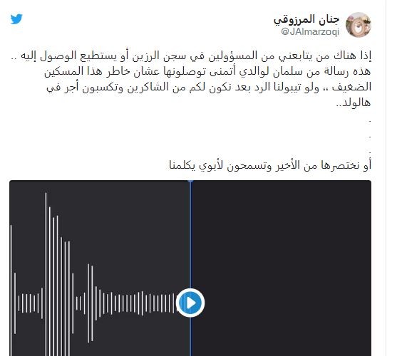 فيما علقت شقيقته جنان المرزوقي مطالبة بإيصال الرسالة لوالدها “إذا هناك من يتابعني من المسؤولين في سجن الرزين أو يستطيع الوصول إليه، هذه رسالة من سلمان لوالدي أتمنى توصلونها عشان خاطر هذا المسكين الضعيف”، مطالبة بالسماح لهما بالحديث مع والدهما.