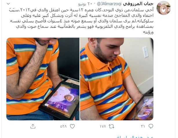 وتابعت أن سلمان لم يرى والده أو يسمع صوته منذ أربع سنوات، فأصبح يسلي نفسه بمشاهدة برامج والده التلفزيونية، فهو يشعر بالطمأنينة عند سماع صوت والده ورؤيته.