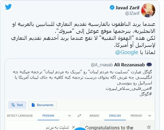وقال ظريف في تغريدة على "تويتر"، إن "غوغل" يقدم ترجمة خاطئة عند نقل التعازي إلى الشعب اللبناني.