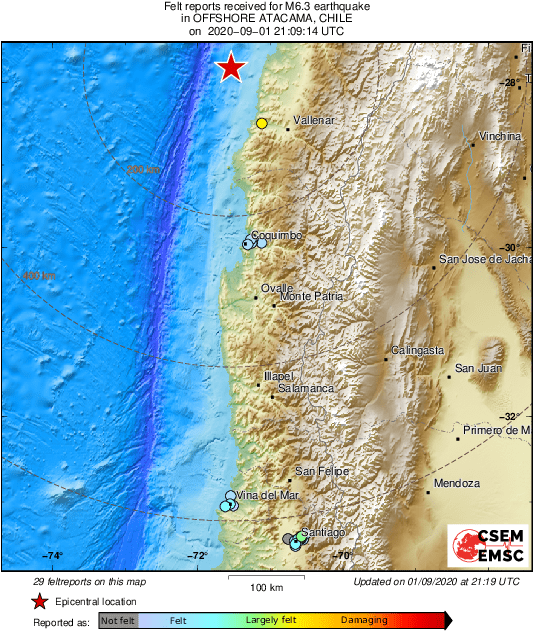 وأفادت هيئة المسح الجيولوجي الأمريكية، بوقوع زلزال بلغت قوته 6.5 درجات على مقياس ريختر في تمام الساعة (21:09) بتوقيت غرينتش، وعلى مسافة 95 كم شمال غرب فالينار في تشيلي.